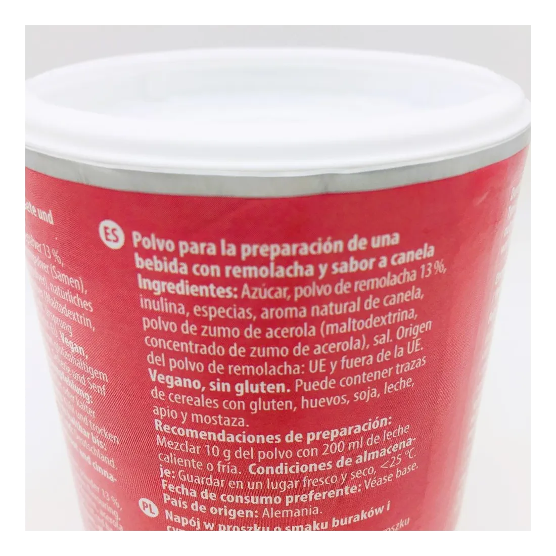 Bebida vegana en polvo con remolacha, saborizante natural de canela y otras especias para preparar una deliciosa bebida con leche. La elección perfecta para quien busca una bebida sabrosa y nutritiva