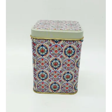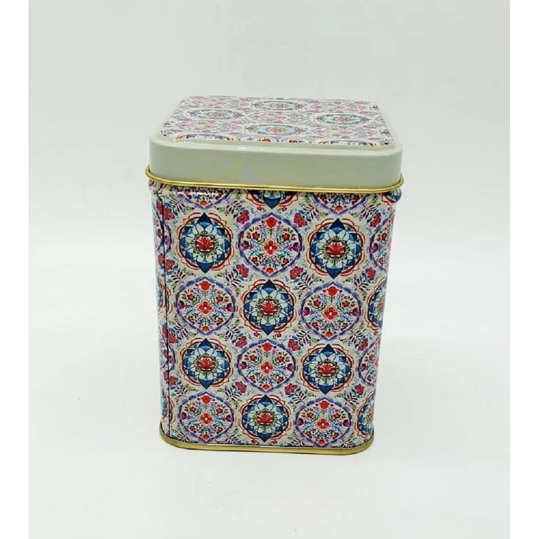 Lata para té capacidad máxima 100gr. decorada estampado simétrico de rosetones de flores rojas y tonos azules y violetas.