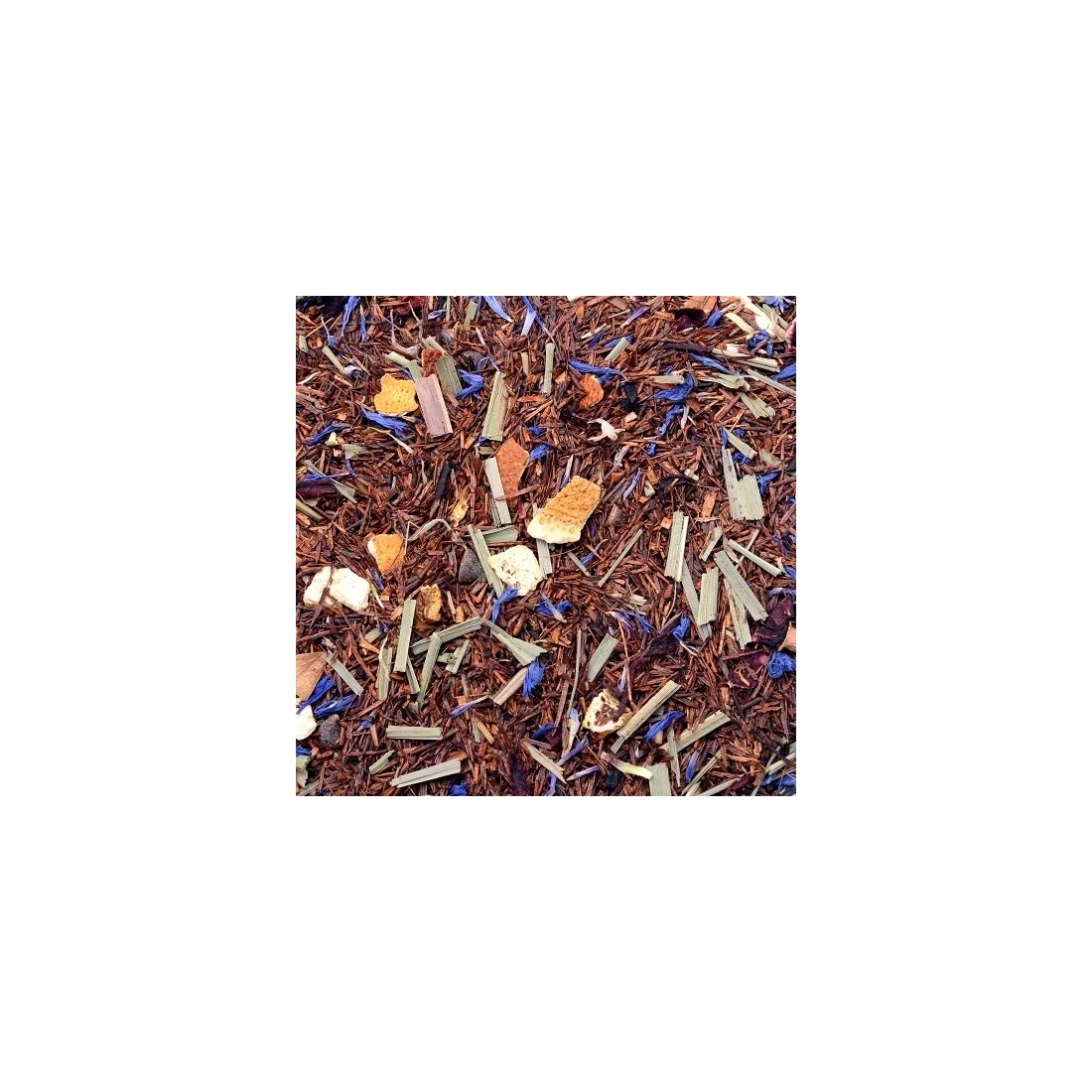 Ingredientes: Rooibos, lemon grass, trozos de chocolate, corteza de naranja, hibisco, pétalos de aciano y aroma natural.