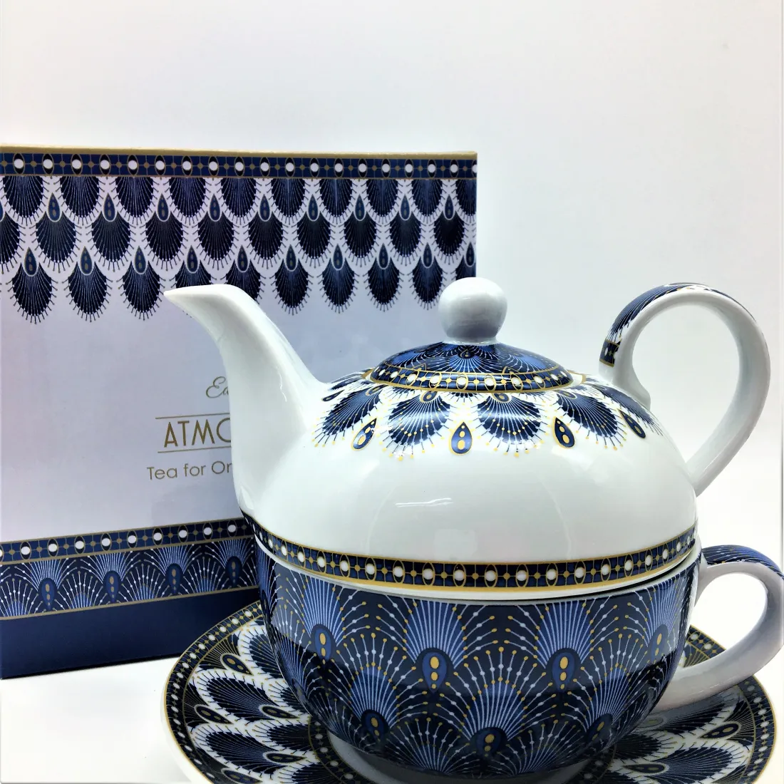 Tea For One cerámica. Tres piezas tetera 0.4 l. taza de 0.2 l. y plato. Decoración azul y blanco.