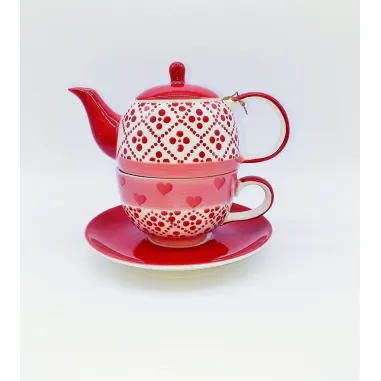 Tea For One. Tres piezas tetera 0.4 l. taza de 0.2 l. y plato. Decoración rojo y blanca, con corazones.