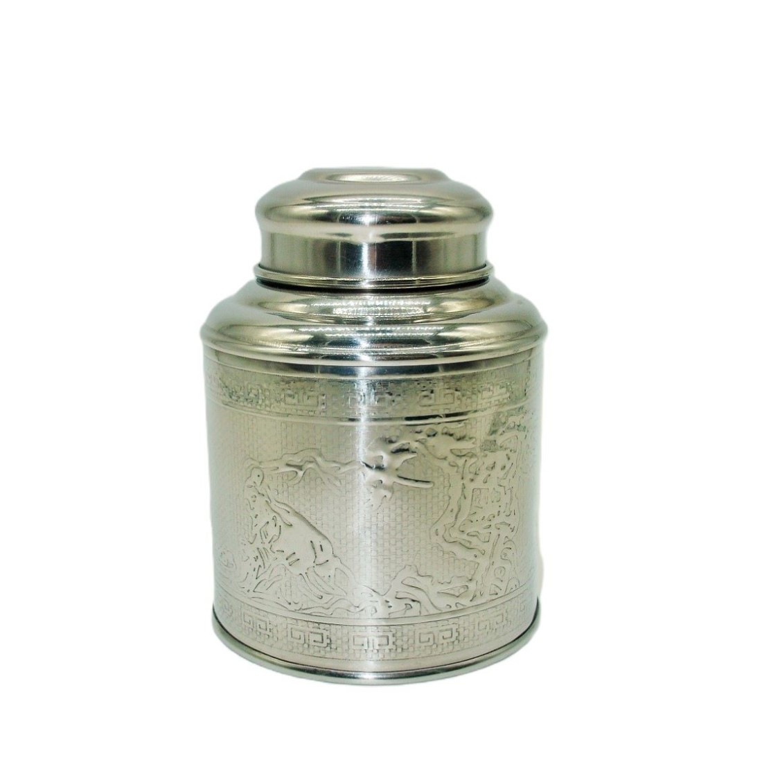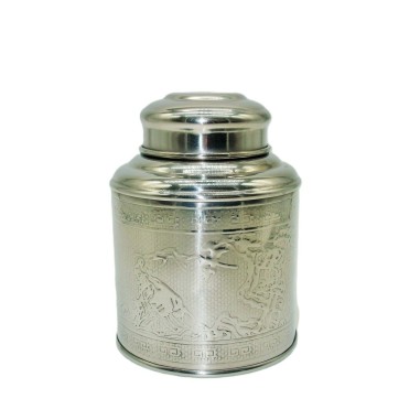 Lata redonda para té, capacidad 125 gr. con forma de lecherita plateada.