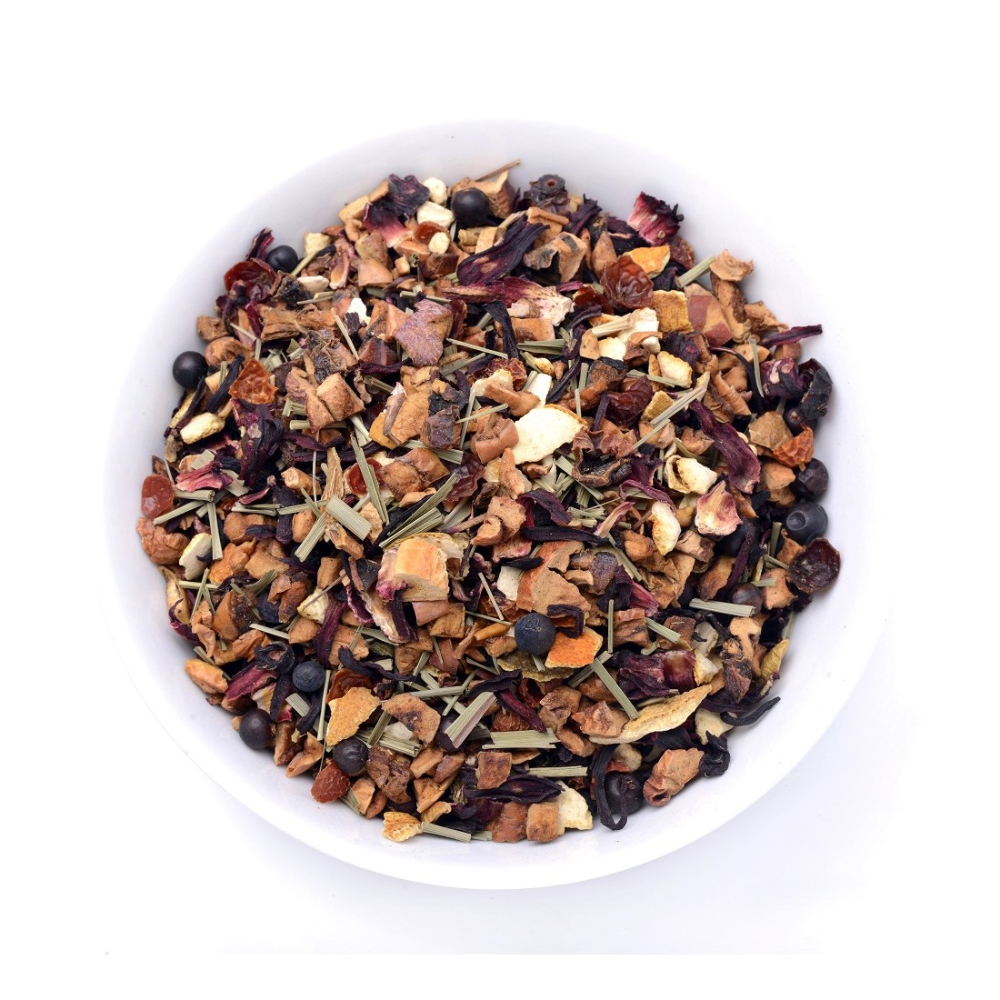 Ingredientes: Manzana, hibisco, pasiflora, naranja corteza, bayas de enebro, escaramujo, lemongrass y aroma.