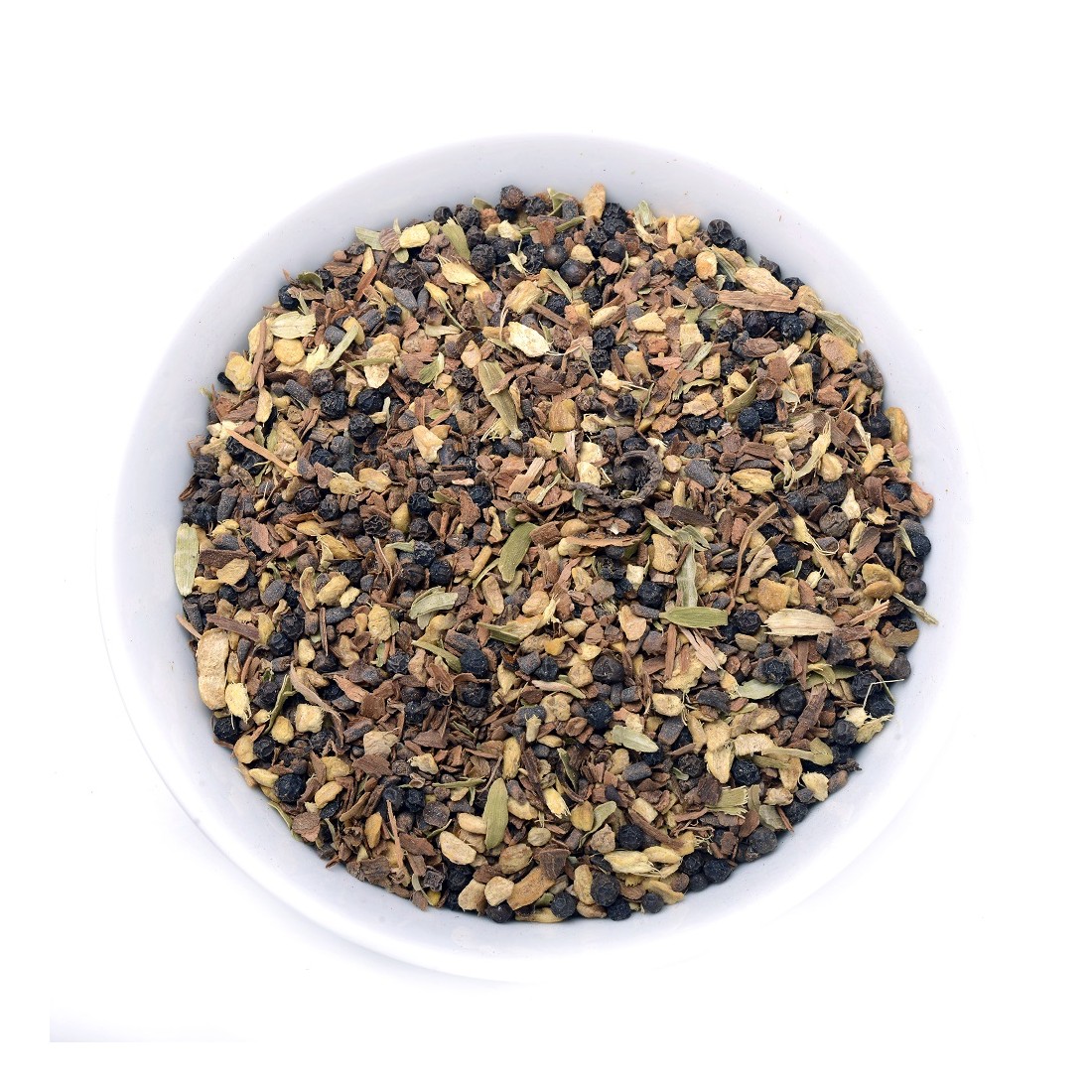 Esta mezcla Ayurvédica ofrece un perfil de sabor complejo y equilibrado. La dulzura de la canela, el picante del jengibre, la intensidad del clavo, la frescura del cardamomo y el toque picante de la pimienta negra se combinan para crear una experiencia de sabor armonios