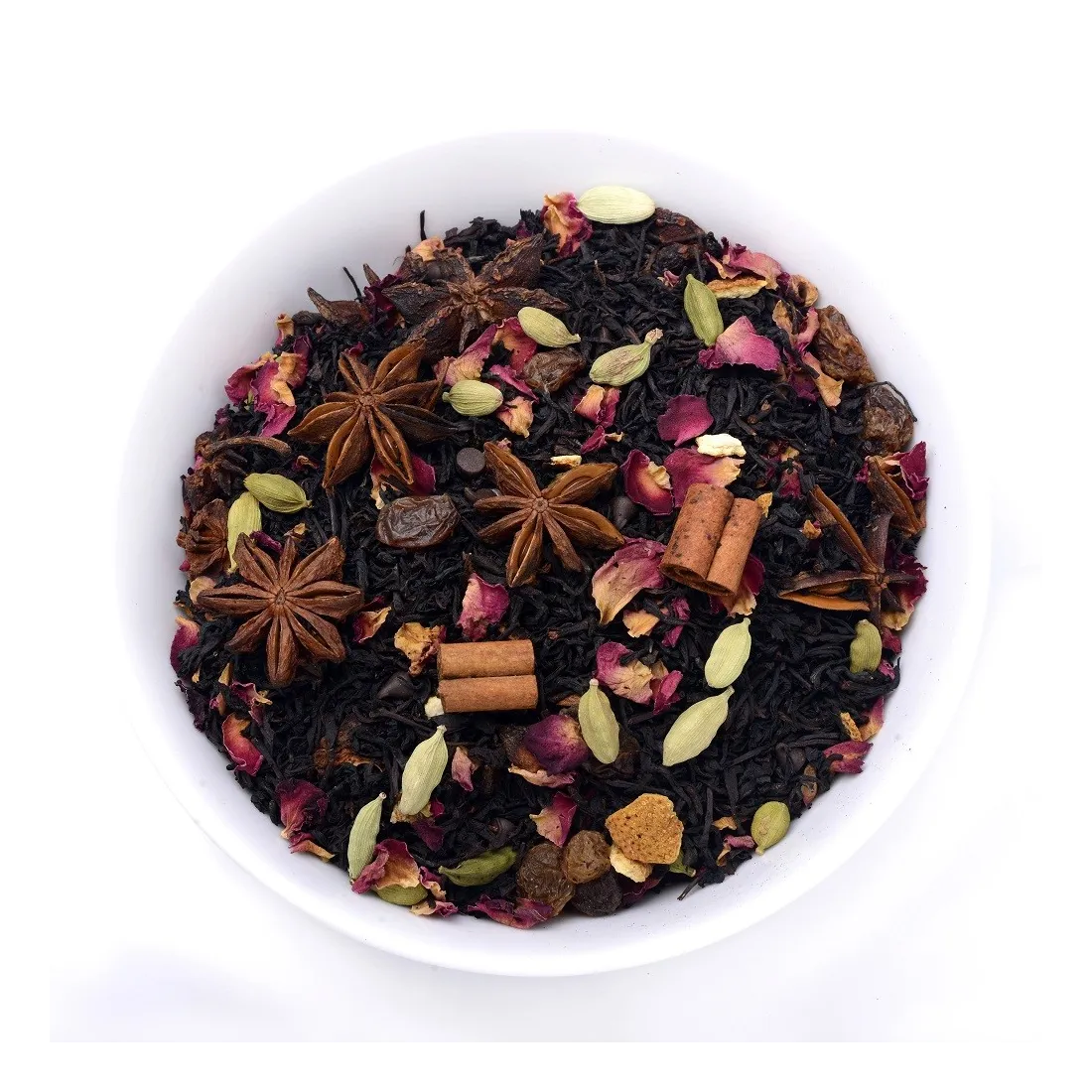 Ingredientes: Té negro, lágrimas de chocolate, pasas, anís estrellado, canela cassia, cardamomo, clavo, corteza de naranja, pétalos de rosa y aroma natural pastel de especias.