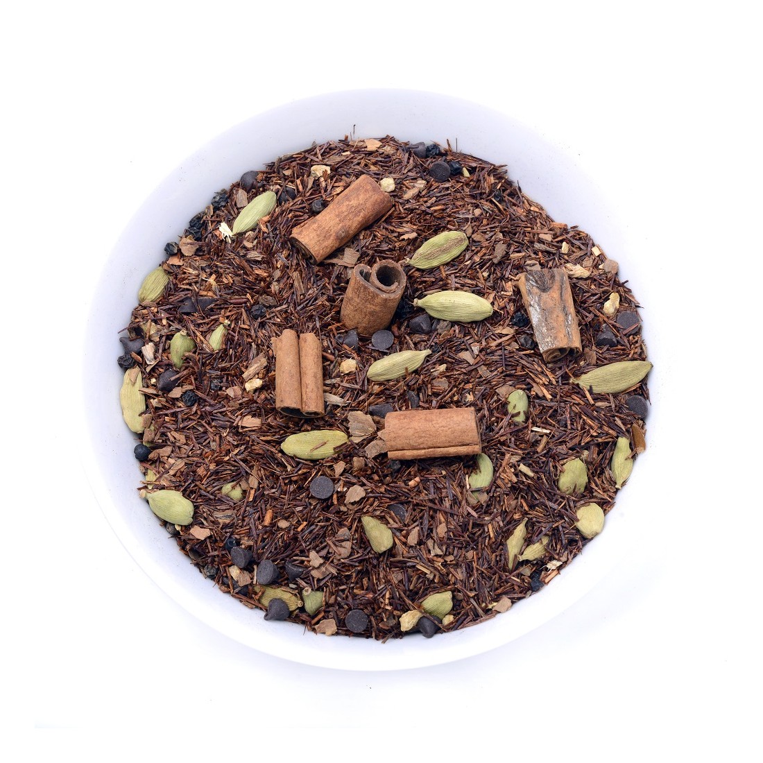 Ingredientes: Rooibos, trozos de chocolate, canela cassia, cardamomo, jengibre, pimienta y aroma natural.