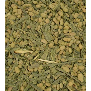 Té verde sencha con arroz tostado y té verde sencha Gyokuro molido (Matcha). Dejar en infusión unos 3 minutos y tomar sin leche.