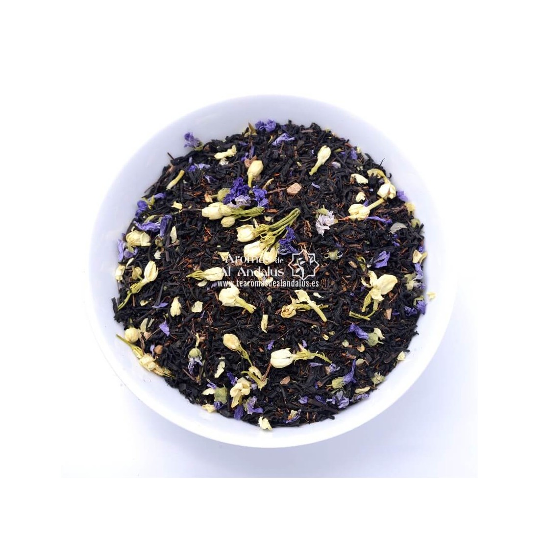 El Té Embrujo de Granada es una rica composición de té negro, rooibos, vainilla, flores de jazmín, malva flor, y trozos de caramelo, complementada con aroma natural. Esta selección de ingredientes no solo proporciona un perfil de sabor excepcional, sino que también incluye lácteos o derivados, añadiendo una suave cremosidad que armoniza perfectamente con la mezcla.
