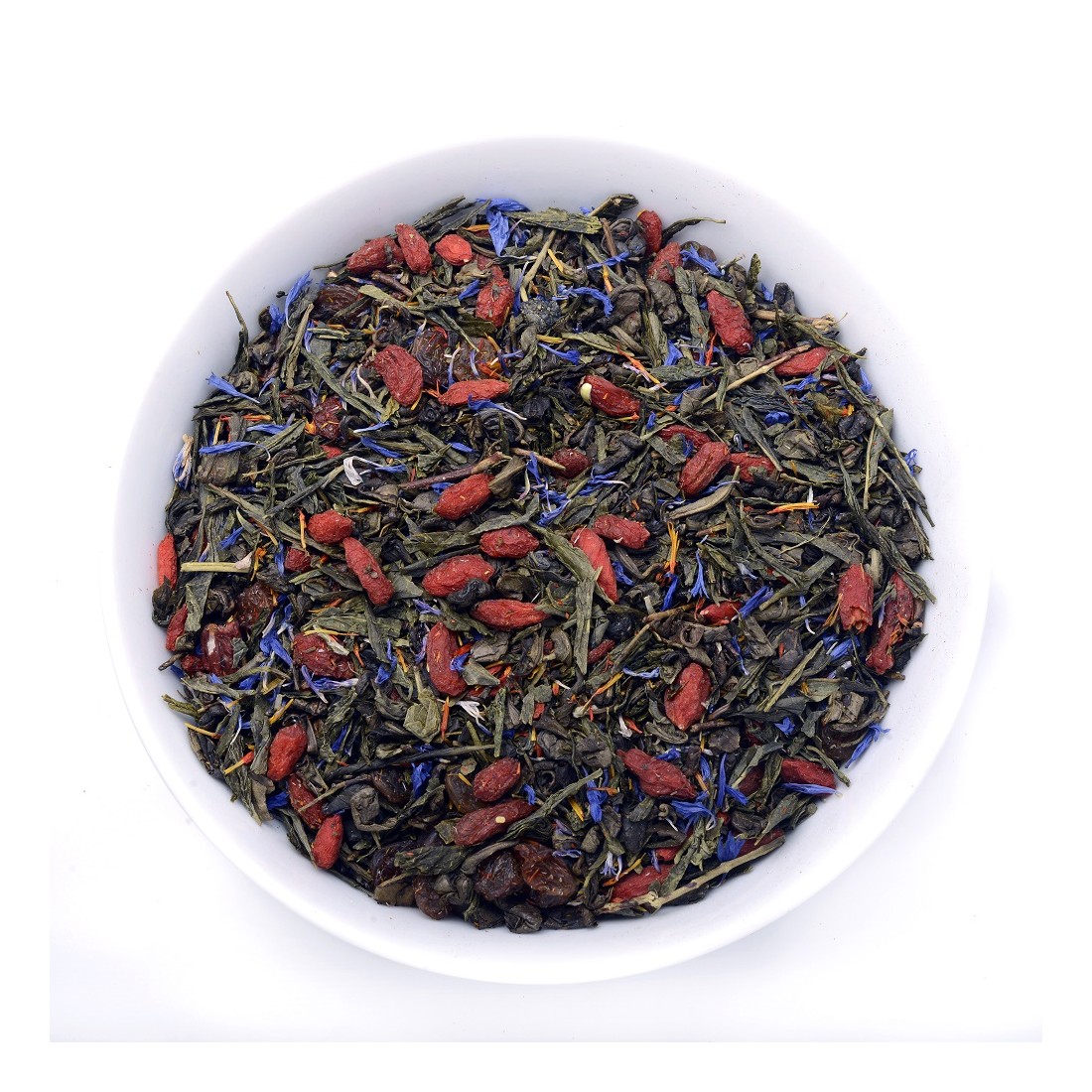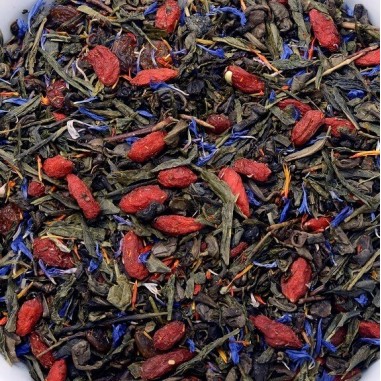 Ingredientes: Té verde Sencha, Gojis Lithium Barbarum*, pasas, pétalos de aciano, flor de cártamo y aroma natural.