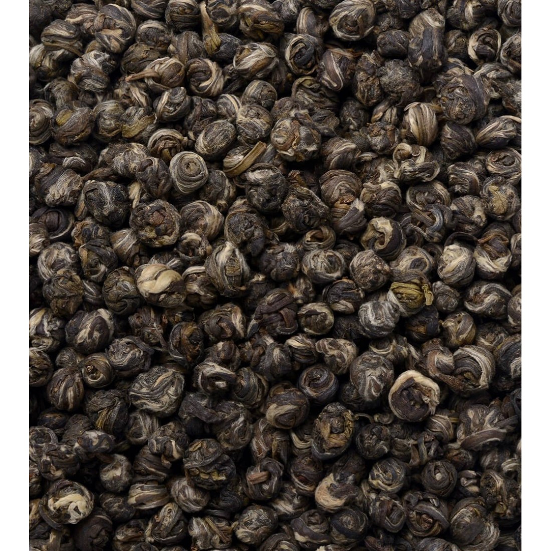 Jasmine "Perlas Dragón" es un té verde delicioso y dulce que combina el té verde, de la más alta calidad, con el aroma y el gusto del jazmín . Está hecho a mano, a partir de la yema de la primera hoja sin abrir, enrolladas en pequeñas bolas, que se despliegan lentamente durante la elaboración de la infusión. Preparar una taza de este dulce té aromático, sólo requiere unas pocas perlas diminutas.